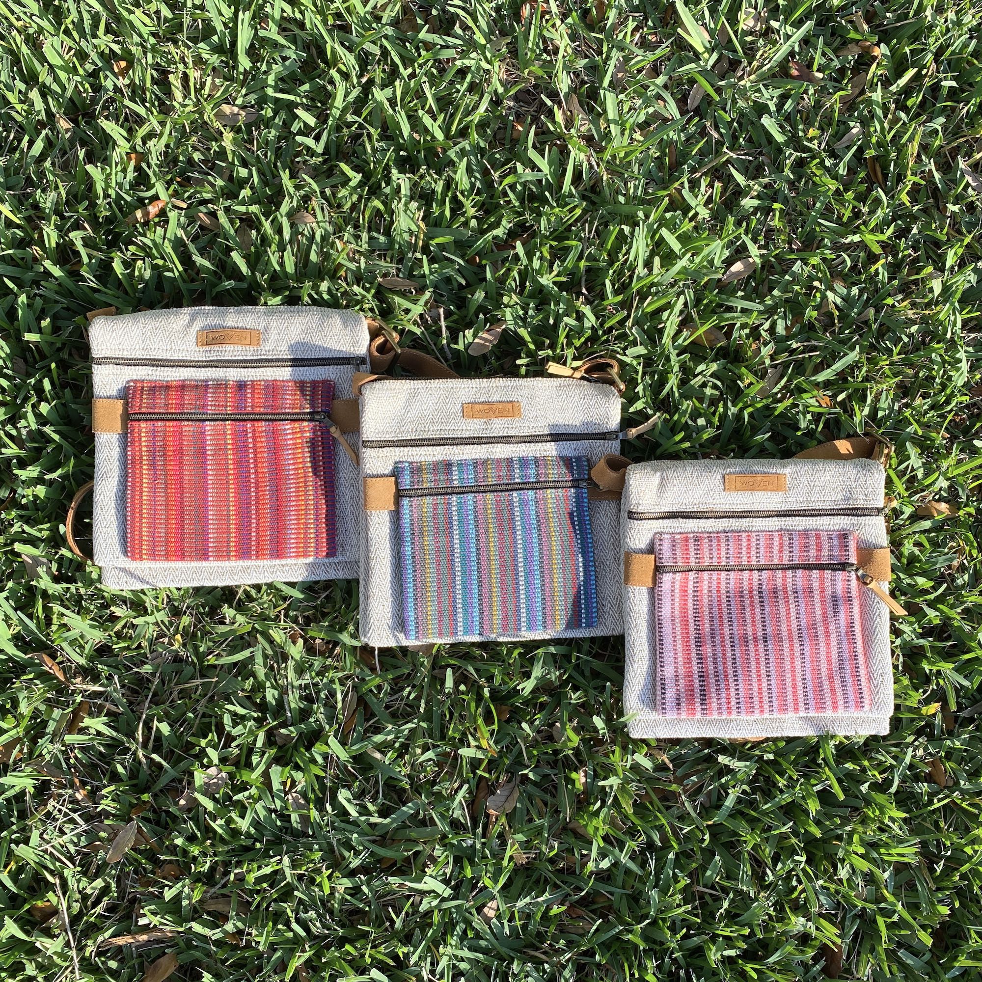 This double-sided crossbody bag is a beautiful fusion of traditional weaving with modern style. It is handmade ethically by a social enterprise called WOVEN in Pokhara, Nepal. The bag is made of handwoven cotton fabric with real suede leather straps.